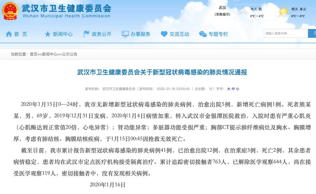 2020年1月15日0—24时,我市无新增新型冠状病毒感染的肺炎病例,治愈出院5例,新增死亡病例1例。死者熊某某,男,69岁,2019年12月31日发病,2020年1月4日病情加重,转入武汉市金银潭医院救治,入院时患有严重心肌炎(心肌酶达到正常值20倍,心电异常);肾功能异常;多脏器功能受损严重;胸部CT提示肺纤维病灶及胸水、胸膜增厚,考虑有肺结核、胸膜结核疾病,于1月15日00:45因抢救无效死亡。 截至目前,我市累计报告新型冠状病毒感染的肺炎病例41例,已治愈出院12例,在治重症5例,死亡2例,其余患者病情稳定,患者均在武汉市定点医疗机构接受隔离治疗。累计追踪密切接触者763人,已解除医学观察644人,尚在接受医学观察119人,密切接触者中,没有发现相关病例。 |
