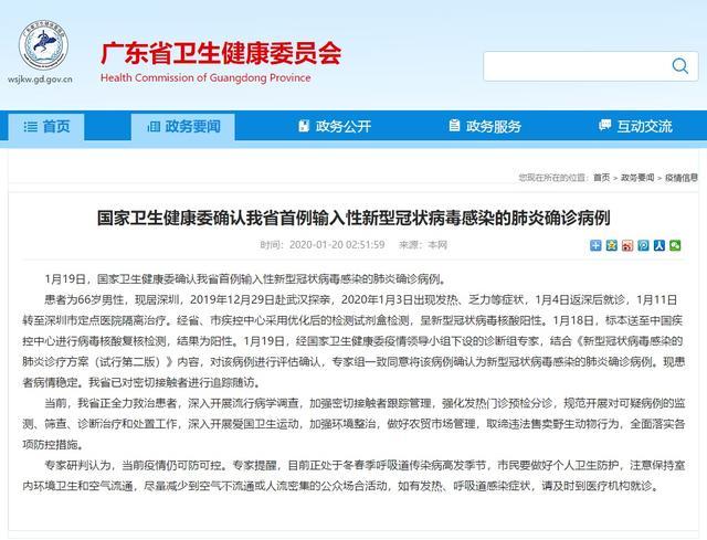 广东省卫生健康委员会刚刚发布消息,1月19日,国家卫生健康委确认广东省首例输入性新型冠状病毒感染的肺炎确诊病例。 患者为66岁男性,现居深圳,2019年12月29日赴武汉探亲,2020年1月3日出现发热、乏力等症状,1月4日返深后就诊,1月11日转至深圳市定点医院隔离治疗。经省、市疾控中心采用优化后的检测试剂盒检测,呈新型冠状病毒核酸阳性。1月18日,标本送至中国疾控中心进行病毒核酸复核检测,结果为阳性。1月19日,经国家卫生健康委疫情领导小组下设的诊断组专家,结合《新型冠状病毒感染的肺炎诊疗方案(试行第二版)》内容,对该病例进行评估确认,专家组一致同意将该病例确认为新型冠状病毒感染的肺炎确诊病例。现患者病情稳定。广东省已对密切接触者进行追踪随访。 当前,广东省正全力救治患者,深入开展流行病学调查,加强密切接触者跟踪管理,强化发热门诊预检分诊,规范开展对可疑病例的监测、筛查、诊断治疗和处置工作,深入开展爱国卫生运动,加强环境整治,做好农贸市场管理,取缔违法售卖野生动物行为,全面落实各项防控措施。 国家卫健委:新型冠状病毒肺炎疫情可控 传染源未找到 据国家卫健委官方微信消息,湖北省武汉市发生不明原因肺炎疫情后,国家卫健委立即派出国家工作组和专家组赶赴武汉,专家研判认为,当前疫情仍可防可控。但新型冠状病毒传染来源尚未找到,疫情传播途径尚未完全掌握,病毒变异仍需严密监控。 据了解,按照属地管理原则,与湖北省、武汉市共同研究落实疫情防控措施。2020年1月1日,国家卫健委成立疫情应对处置领导小组,会商分析疫情发展变化,研究部署防控策略措施,及时指导、支持湖北省和武汉市开展病例救治、疫情防控和应急处置等工作。 据介绍,国家卫健委第一时间组织中国疾控中心、中国医学科学院、中国科学院、军事科学院军事医学研究院等单位对病例样本进行实验室平行检测。2020年1月8日,初步确认了新型冠状病毒为此次疫情的病原。随即,进一步加强部门联动,研究共同加强疫情防控工作的具体举措。召开全国卫生健康系统电视电话会议,对全国疫情防控工作进行全面部署。印发病例诊疗、防控方案(涵盖监测、流调、密切接触者管理、实验室检测等内容),在全国建立了“日报告、零报告”制度。下发新型冠状病毒核酸检测试剂盒,要求各地加强检测,全力救治患者,及时发布确诊病例及疫情防控信息。全国爱卫办部署开展以加强市场环境卫生整治工作为主题的冬春季爱国卫生运动。 近日,国家卫健委陆续向全国各省派出工作组,指导做好疫情防控相关工作。同时,加强国际合作与交流,与世界卫生组织、我国港澳台地区和有关国家及时通报疫情信息和防控工作进展,第一时间向世界卫生组织共享新型冠状病毒基因序列,疫情应对处置工作得到了世界卫生组织的充分肯定。 下一步,国家卫健委将加强部门协调联动,严格落实疫情防扩散措施。继续做好全国疫情防控工作,及时发现并有效处置疫情。组织开展好爱国卫生运动,加大环境卫生整治力度。继续加强病毒溯源和变异监测工作,做好应对疫情变化的技术准备。国家卫健委将加强春节期间值班值守,密切关注疫情防控形势发展变化,指导各地落实防控措施。 |