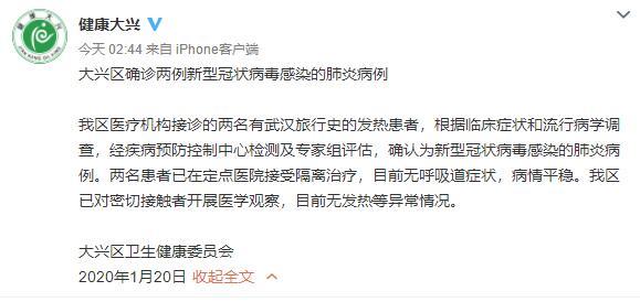 人民网北京1月20日电(记者 白宇)据北京市大兴区卫生健康委员会官方微博消息,大兴区确诊两例新型冠状病毒感染的肺炎病例。大兴区医疗机构接诊的两名有武汉旅行史的发热患者,根据临床症状和流行病学调查,经疾病预防控制中心检测及专家组评估,确认为新型冠状病毒感染的肺炎病例。 两名患者已在定点医院接受隔离治疗,目前无呼吸道症状,病情平稳。大兴区已对密切接触者开展医学观察,目前无发热等异常情况。