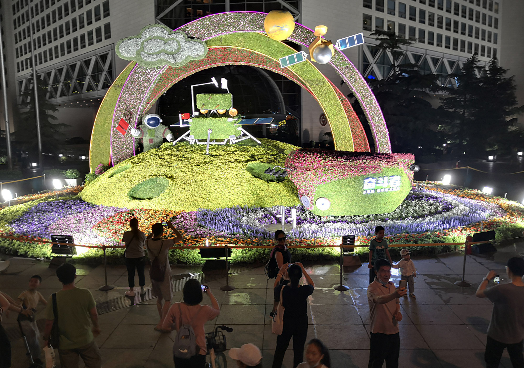 长安街沿线花坛夜景 东城区在钟鼓楼广场、安定门桥头、张自忠路西南角、五四大街、前门大街北广场、天坛东门东侧等9个重要点位,布置10座立体花坛;西城区以“喜迎庆典 共谱乐章”为主题,在中轴路设置5处大型立体主题花坛,在5处区属重点公园内设置中小型立体主题花坛。造型别致、色彩艳丽的花卉组合,成为献给城市的节日礼物。