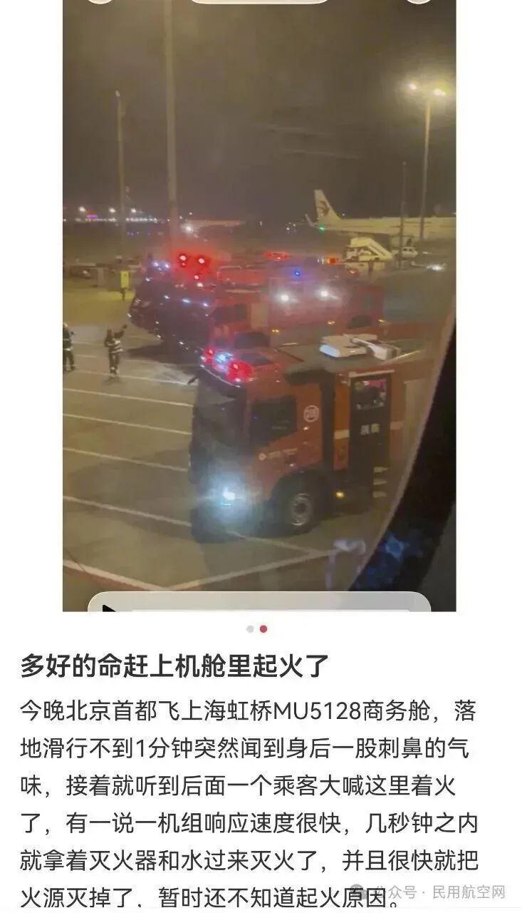 ![]() 3月22日晚, 有乘客在社交媒体晒出 东航MU5128航班 落地上海虹桥机场后, 机舱内出现火情, 机组人员迅速灭火。 通过该乘客晒出的照片可以看到机舱外还停着多辆消防车。记者查询航旅纵横看到,MU5128航班昨晚21:03从北京首都机场起飞,于22:41落地上海虹桥机场。 有网友当晚在社交媒体发文:今晚北京首都飞上海虹桥MU5128商务舱,落地滑行不到1分钟突然闻到身后一股刺鼻的气味,接着就听到后面一个乘客大喊这里着火了,有一说一机组响应速度很快,几秒钟之内就拿着灭火器和水过来灭火了,并且很快就把火源灭掉了,暂时还不知道起火原因。