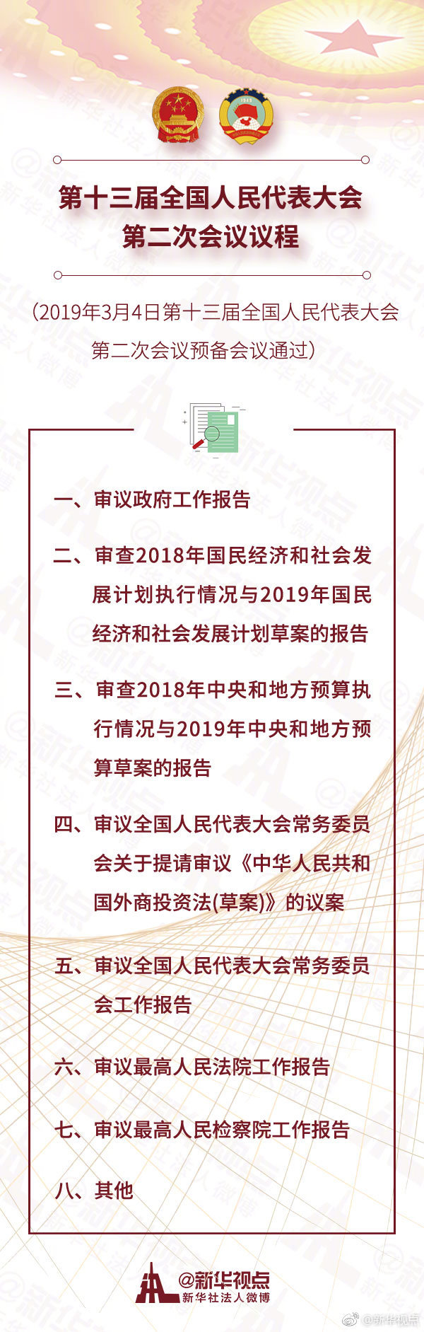 新华社北京3月4日电 十三届全国人大二次会议4日上午在人民大会堂举行预备会议。全国人大常委会委员长栗战书主持会议。会议选举产生了十三届全国人大二次会议主席团和秘书长,表决通过了十三届全国人大二次会议议程。 栗战书在主持会议时宣布:第十三届全国人民代表大会第二次会议于2019年3月5日召开,大会的各项准备工作已经全部就绪。 预备会议经表决,选举产生了十三届全国人大二次会议主席团和秘书长。大会主席团由176人组成,王晨为大会秘书长。 根据表决通过的会议议程,十三届全国人大二次会议将审议政府工作报告,审查2018年国民经济和社会发展计划执行情况与2019年国民经济和社会发展计划草案的报告,审查2018年中央和地方预算执行情况与2019年中央和地方预算草案的报告,审议全国人大常委会关于提请审议外商投资法草案的议案,审议全国人大常委会工作报告,审议最高人民法院工作报告,审议最高人民检察院工作报告等。 ![]()