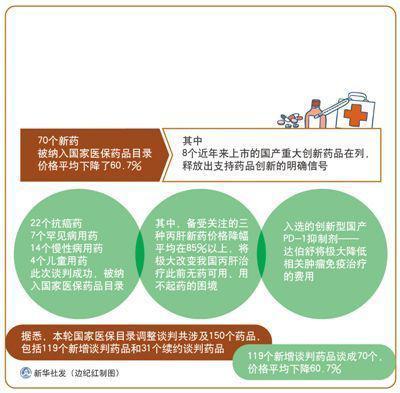 制图:边纪红(新华社发) 近日,国家医保局、人力资源社会保障部印发《关于将2019年谈判药品纳入〈国家基本医疗保险、工伤保险和生育保险药品目录〉乙类范围的通知》,正式公布谈判药品准入结果。新版药品目录有何亮点、何时落地?对患者有何实际影响?有关部门负责人和业内专家对此进行解读。 ●绝大多数是近年来上市的新药 本次谈判共涉及150个药品,包括119个新增谈判药品和31个续约谈判药品。新增谈判药品谈成70个,价格平均下降60.7%;其中三种丙肝治疗用药降幅平均在85%以上,肿瘤、糖尿病等治疗用药的降幅平均在65%左右。续约药品谈成27个,价格平均下降26.4%。 国家医保局医药服务管理司司长熊先军介绍,此次谈判成功的药品多为近年来新上市且具有较高临床价值的药品,涉及癌症、罕见病、风湿免疫、心脑血管、消化等10余个临床治疗领域。重点领域的5个基本药物全部谈判成功,22个抗癌药、7个罕见病用药、14个慢性病(含糖尿病、乙肝、风湿性关节炎等)用药、4个儿童用药谈判成功,进一步优化目录结构。 这次谈判成功的药品有很多是2018年新上市的。比如进入医保的唯一PD—1类肿瘤免疫治疗药信迪利单抗注射液,该药是国家重大科技专项——“重大新药创制”的成果,去年12月才获批上市。作为一种临床效果较好的免疫类肿瘤用药,该药进入医保将帮助更多患者用上免疫治疗药物。 在去年18个肿瘤治疗药物的医保准入谈判中,用于骨髓纤维化疾病治疗的药物磷酸芦可替尼成为唯一没有谈判成功的药物。在今年谈判中,该药物给出全球最低价,成功进入医保目录。该公司有关负责人介绍,创新药物的医保目录准入周期大幅缩短,进一步增强了企业研发创新药物的信心。 此外,肺癌、直肠癌、乳腺癌等有了更多靶向和化疗药选择,波生坦、麦格司他等药品的谈判成功,使肺动脉高压、C型尼曼匹克病等罕见病患者摆脱目录内无药可治的困境,糖尿病、乙肝、类风湿性关节炎、耐多药结核、慢性阻塞性肺炎等患者也有了更多优质新药可供选择。 ●患者个人自付比例可降至原来20%以下 此次谈判以量换价推动药费大幅下降,多个全球知名的名贵药开出了优惠价,多数进口药品给出全球最低价。据初步估算,新增的70个药品如按50%的实际报销比例计算,患者个人自付比例将降至原来的20%以下,个别药品的自付比例将降至原来的5%。续约药品患者个人自付比例也将同步下降。 新型能口服的丙肝治疗药物此次也经谈判进入医保。中国科学院院士、国家感染病临床研究中心主任王福生介绍,该药物临床治愈率达近100%,但费用较高,一个疗程费用在3万—7万元。“通过国家医保谈判,拿到了全球少见的低价,解决了原来药品价格高的问题,同时国家承担大部分费用,解决我国近千万患者承担不起医疗费用的问题,大大减轻了患者的经济负担。” 谈判组成员、福建省药械联合采购中心负责人林崧介绍,对6个丙肝用药引入竞争性谈判的方式。“与以往不同,这种谈判方式需要对企业申报的数据做出准确的分析判断,还要换算比对数据,做出结果判定。”通过竞争性谈判,企业报价大幅下降,达到了预期目标。 国家医保局还引入价格保密的做法,对部分药品的成交价格承诺官方不对社会公开。“明年目录落地后,广大群众会有切身感受。”熊先军说。 ●新版医保目录将于明年1月1日实施 通知要求,谈判准入药品与常规准入药品拟于2020年1月1日起同步实施。谈判成功的药品将采用全国统一的支付标准。支付标准包括了基金和参保人员共同支付的全部费用,基金和参保人员分担比例由各统筹地区确定。协议有效期截至2021年12月31日,有效期满后按照医保有关规定调整支付标准。 有效期内,如有同通用名药物(仿制药)上市,医保部门将根据仿制药价格水平调整该药品的支付标准,也可将该通用名纳入集中采购范围。如出现国家重大政策调整或药品市场实际价格明显低于现行支付标准的,国家医保局将与企业协商重新制定支付标准并另行通知。 |