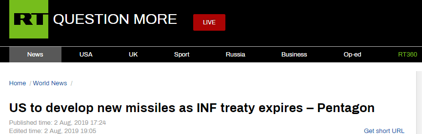 (RT报道截图) 报道称,今年2月,美国以俄罗斯违反《中导条约》为借口宣布将退出条约,美方将暂停履行条约义务,启动为期6个月的退约程序。8月2日,美国正式退出条约。 “美国2019年2月2日限俄罗斯6个月内重新开始遵守《中导条约》,但俄罗斯予以拒绝,因此条约效力今日终止”,美国国务卿蓬佩奥2日发表推特,宣布华盛顿正式退出这一被称为“全球安全支柱”的军控条约。据美国有线电视新闻网(CNN)2日报道,蓬佩奥表示,俄罗斯没有销毁其不符合条约规定的导弹系统,未能证明莫斯科完全遵守这一条约,因此应对条约的终止负全责。 据俄新社2日报道,俄罗斯外交部当天发表声明,批评华盛顿退出《中导条约》是严重错误。美国以俄罗斯违反《中导条约》为由退出该条约,是故意制造误导性信息,以此摆脱自己设定核武限制。不过俄外交部表示,莫斯科仍然愿意与华盛顿就恢复信任和加强国际安全问题进行平等和建设性对话。俄副外长里亚布科夫2日表示,俄罗斯仍像从前一样呼吁北约和美国宣布暂停在欧洲部署新导弹。 据路透社2日报道,联合国秘书长古特雷斯1日称,《中导条约》乃是划时代的条约,曾助力实现欧洲稳定并结束冷战;条约失效后,“世界会失去阻止冲向核战的刹车”。作为《中导条约》的牵头人之一,戈尔巴乔夫1日告诉俄罗斯国际文传电讯社,美国退出该条约可能对欧洲以及全球安全体系造成重击,导致国际政治朝着不确定和混乱的方向发展。  |