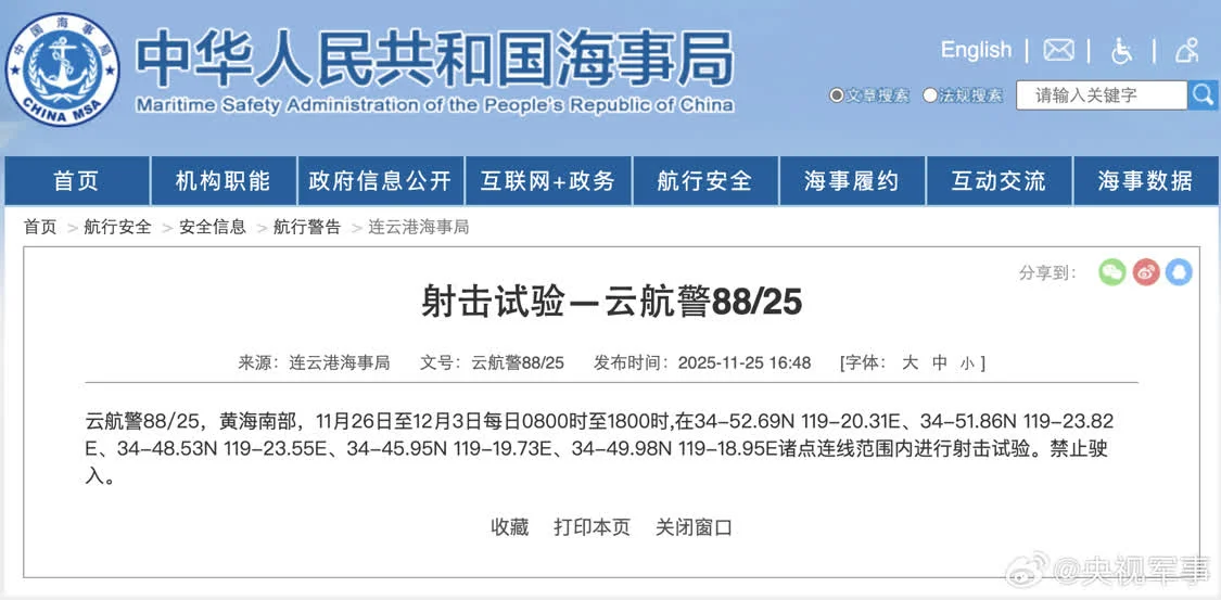 据中国海事局网站消息,连云港海事局发布航行警告,11月26日至12月3日每日8时至18时,黄海南部部分海域进行射击试验,禁止驶入。 |