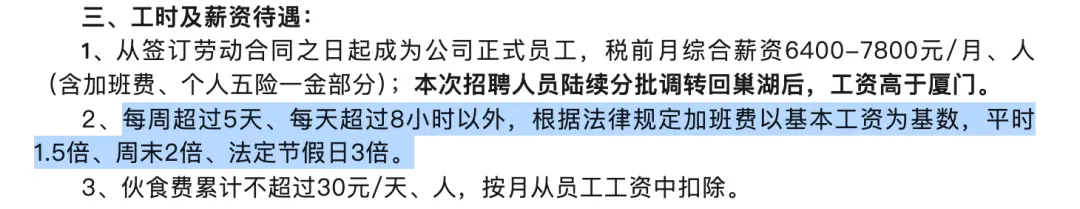 前述涨薪通知传出后,在网络上引发热议。部分网友认为,单人的涨薪金额并不高。但也有网友表示,“有得涨就不错了”“总比没有强”。 还有观点指出,此次加薪的150元涨幅会纳入员工的基本工资范畴。若综合考虑公司的加班补偿、五险一金等福利项目,基层员工实际到手的薪资可能更多。 据公众号“黄平就业服务中心”于今年11月下旬发布的宁德时代(巢湖基地)招聘简章,前者近期正在招聘生产技术员,以及重岗(重要岗位)、核岗(核心岗位)储备员工。 天眼查显示,厦门时代新能源科技有限公司成立于2022年3月,由宁德时代全资控股。据悉,本次招聘人员到厦门基地培训上岗,2026年起可按照生产计划陆续分批调转回巢湖。 薪资方面,此次招聘通过后,正式员工的税前月综合薪资为6400-7800元/月、人(含加班费、个人五险一金部分)。 关于加班,若每周工作超过5天,且每天工作时间超过8小时,根据法律规定,加班费将以基本工资为基数进行计算,平时加班为1.5倍工资,周末加班为2倍工资,法定节假日加班则为3倍工资。