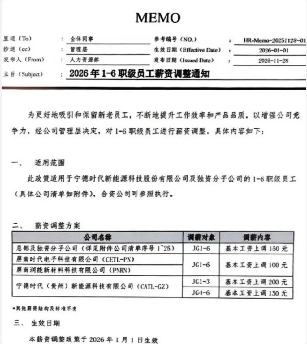 涨薪坚守奖励计划齐发,宁德时代“竭力留人” 12月1日,据中国企业家杂志报道,就近日网传宁德时代给基层员工涨薪一事,宁德时代创始人、董事长曾毓群回应称——“没错”。 据此前网传的宁德时代薪资调整通知,为更好地吸引和保留新老员工,不断地提升工作效率和产品品质,以增强公司竞争力,经公司管理层决定,自2026年1月1日起对1-6职级员工进行薪资调整。 据了解,此次宁德时代涨薪主要惠及基层员工。其中,总部及独资分子公司中JG1-6职级的员工,基本工资将上调150元,其他薪资构成及标准保持不变。