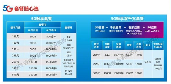 在5G畅享套餐上,129元档包含30GB全国流量和500分钟全国通话;169元档包含40GB全国流量和800分钟全国通话;199元档包含60GB全国流量和1000分钟全国通话;239元档包含80GB全国流量和1000分钟全国通话;299元档包含100GB全国流量和1500分钟全国通话;399元档包含150GB全国流量和2000分钟全国通话;599元档包含300GB全国流量和3000分钟全国通话。 套餐外流量3元/GB,语音0.15元/分钟,短信0.1元/条,语音加装包10元/100分钟(可多次订购),可选购2张副卡,10元/张。 中国电信还推出了229元-399元的3档5G畅享双千兆套餐,融合了5G套餐+千兆宽带+智家应用+5G应用,适合同时使用中国电信手机号码和宽带的用户选择。具体而言,229元档包含40GB全国流量,800分钟全国通话,500M宽带;299元档包含80GB全国流量,1000分钟全国通话,500M宽带;399元档包含100GB流量,1500分钟全国通话,1000M宽带。3档5G畅享双千兆套餐,都包含1路4K天翼高清,以及会员价购买智家应用和5G应用。 5G应用包含天翼超高清、天翼云游戏、天翼云VR、天翼云电脑和天翼云盘,零售价分别为每月19.9元、29.9元、29.9元、29.9元/59.9元、29元;会员价分别为每月10元、25元、25元、25元/49元、5元/3元。 此外,中国电信此次还将129-169元档的5G畅享套餐用户归为黄金会员,将199元档以上的5G畅享套餐用户归为白金会员。首批会员(2019年12月31日前办理5G畅享套餐的用户)将在网络权益、生态权益和5G应用上享受相关服务。 |