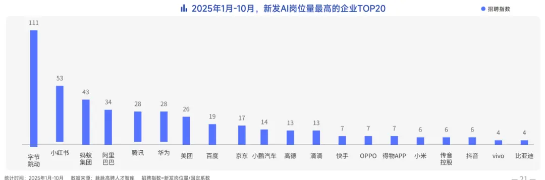 ![]() “AI人才争夺战”打响,字节一骑绝尘 有观点认为,除良好的业绩表现托底外,国内外日益激烈的AI竞争环境,或是促使字节跳动此番涨薪的重要原因之一。AI生态的搭建不仅需要算力支撑,更需要人才去执行规划、做出创新。 今年10月,久未公开露面的字节跳动创始人张一鸣,公开现身上海徐汇知春创新中心开业典礼。 而由张一鸣和上海交大俞勇教授共同发起的知春创新中心,正是为了寻找和培养泛计算机和人工智能领域的创新人才而设立。 此外,据英国《金融时报》去年12月报道,有字节跳动内部人士称,张一鸣卸任公司CEO后,一直在积极参与公司的AI战略,并亲自监督从竞争对手公司招聘AI工程师和研究人员的工作。 据多位了解招聘的人士透露,字节跳动当时从阿里巴巴、零一万物和智谱等公司请来顶级AI工程师和研究人员。公司还创建并扩展了团队,以开发其大语言模型和AI产品。 今年上半年,字节引入原Google DeepMind副总裁吴永辉,由其担任大模型Seed基础研究负责人,并推动AI Lab和大模型团队Seed合并。 此外,据脉脉⾼聘人才智库今年12月发布的《2025年度人才迁徙报告》,在国内AI人才招聘方面,字节跳动一骑绝尘。 今年前10个月,字节跳动新发岗位量呈现出断层式领先态势,其以897的招聘指数在一众企业中独占鳌头,远超其竞争对手阿里巴巴(407)和腾讯(370)。 若仅聚焦新发AI岗位量,字节跳动依旧稳坐头把交椅,其招聘指数高达111,充分彰显其在AI领域的持续深耕与巨大投入。同期,阿里巴巴、腾讯的招聘指数分别为34、28,与字节跳动差距明显。