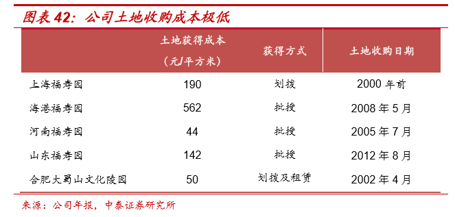 ![]() 但市界最新报道称,实际情况并不如此。据业内人士介绍,截至目前,有将近一半,也就是十五六家已经卖完。北京六环内的陵园大多接近饱和,位于海淀区香山南路的万安公墓早已一墓难求。 《公益时报·中国殡葬》相关高层人士对时间财经表示,北京市殡葬协会副会长姜晓刚的估计并没有错。目前的墓地存量是比较宽松,同时葬式葬法正在多样化。特别是国家限制墓穴的标准,降低了墓穴占地空间,给公墓发展延长了时间。 对于为何墓穴价位年年攀升,《公益时报·中国殡葬》相关高层人士直言是经营者在炒作。 此前北京工业大学教授、中国殡葬协会专家委员会委员王国华也曾公开表示,国家在殡、葬、祭这方面都是给了一定的政策的宽松的。比如说在墓地征地,不会像房地产征地,收那么高的青苗补偿费。有一些墓地是在半山和丘陵地带,费用很低。与此同时,墓地还有很多不征税或者半交管理费的方式。国家给这个行业是有一定补偿的。所以殡葬业不是一个充分竞争的行业,而且带有公共福利性质。 中泰证券研究所给出的一份表格显示,福寿园土地收购成本极低。与前文所推测的22万元/平方米售价,几乎相差逾20倍。