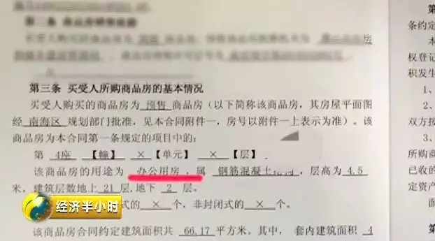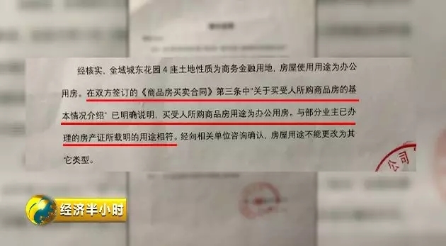 业主李女士 在业主看来,万科不仅存在虚假宣传,而且购房合同中对于房屋性质的认定,也自相矛盾。 金域城东花园的高小姐是万科金域中央楼盘中最早签订合同的业主之一,她的购房合同第三条明确写着商品房用途为“办公”,但第十八条却写着房屋仅作“公寓式办公”使用。