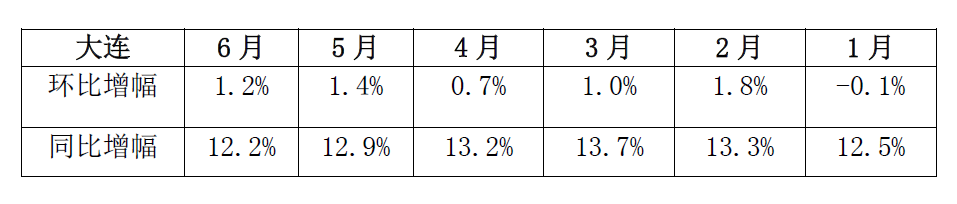 数据来源:国家统计局 根据国家统计局发布的70个大中城市商品住宅销售价格变动情况统计数据,今年4月份,大连新建商品住宅环比增长0.7%、同比增长13.2%,在70城中并不算很靠前。但是5、6月份,环比增速分别为1.4%、1.2%,位居70个大中城市的前10名。 |