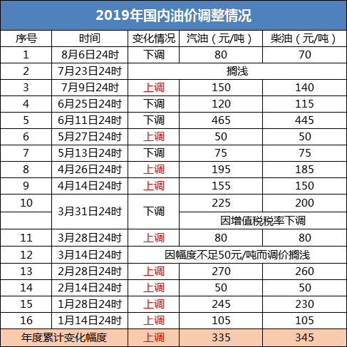 数据来源于国家发改委 中国网财经畅帅帅制表 2019年以来,国内成品油价已经历16次调整,除4月1日因消费税税率下降引发的国内油价顺势下调外,呈现9涨4跌2搁浅的格局。涨跌互抵后,较年初来看,汽油价格已累计上调335元/吨,柴油价格已累计上调345元/吨。 关于油价未来的走势,金联创表示,国际油价短期或仍维持偏弱震荡格局,新一轮计价周期参考原油变化率或在0上下运行,零售价暂时存搁浅搁浅,消息面指引较为有限。进入中下旬,国内部分主营单位销售压力渐增,消息面并没有强势利好支撑的情况下,不排除部分单位或暗中促销的可能,但鉴于外采成本支撑,整体跌价空间也或将有限。 山西证券研报也指出,沙特8月和9月会继续限制石油产量和出口,从而降低供应过剩水平,一定程度抵消油价的利空因素,油价维持区间震荡。当前需求面疲软的局面下,除地缘政治风险等因素干扰,预计后续油价仍将弱势运行。 |