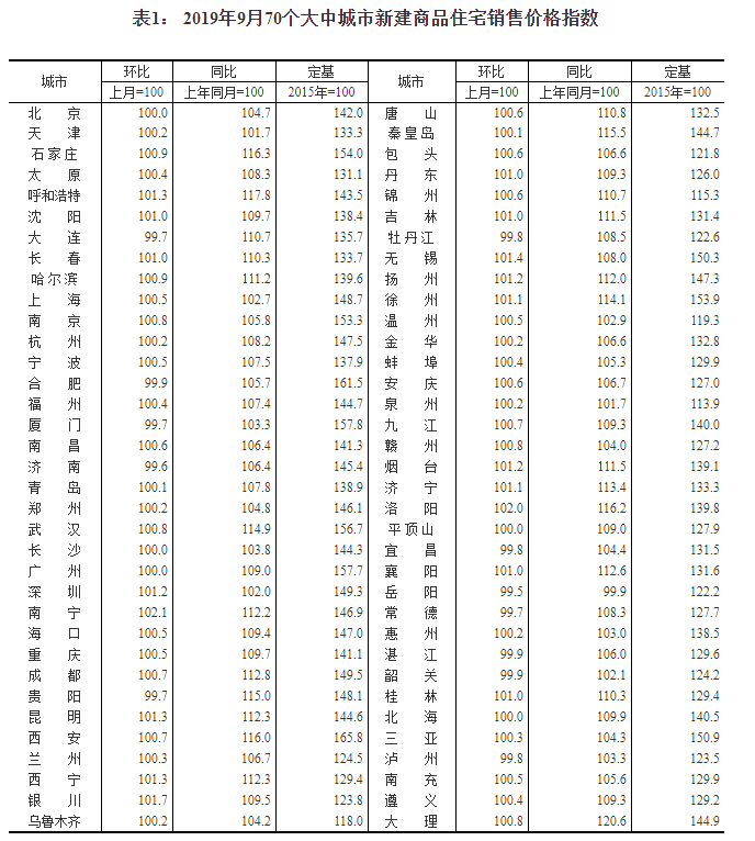 国家统计局今日发布了2019年9月份70个大中城市商品住宅销售价格变动情况统计数据。对此,国家统计局城市司首席统计师孔鹏进行了解读。 一、新建商品住宅销售价格环比涨幅微升,二手住宅销售价格涨幅基本持平 9月份,各地坚决贯彻党中央、国务院部署,坚持“房住不炒”定位,进一步落实房地产长效管理机制,房地产市场价格总体稳定,略有升降。初步测算,4个一线城市新建商品住宅销售价格环比上涨0.4%,涨幅比上月扩大0.1个百分点。其中,北京和广州持平,上海和深圳分别上涨0.5%和1.2%。二手住宅销售价格环比上涨0.3%,上月为持平。其中,北京和广州分别下降0.5%和0.3%,上海和深圳分别上涨0.6%和1.3%。31个二线城市新建商品住宅销售价格环比上涨0.6%,涨幅比上月扩大0.1个百分点;二手住宅销售价格环比上涨0.2%,涨幅与上月相同。35个三线城市新建商品住宅销售价格环比上涨0.8%,涨幅比上月扩大0.1个百分点;二手住宅销售价格环比上涨0.7%,涨幅比上月回落0.1个百分点。 二、一线城市新建商品住宅和二手住宅销售价格同比涨幅略有扩大,二三线城市涨幅均回落 初步测算,9月份,一线城市新建商品住宅销售价格同比上涨4.6%,涨幅比上月扩大0.4个百分点;二手住宅销售价格同比上涨0.1%,上月为下降0.2%。二线城市新建商品住宅和二手住宅销售价格同比分别上涨9.3%和4.7%,涨幅比上月分别回落0.6和0.8个百分点。三线城市新建商品住宅和二手住宅销售价格同比分别上涨8.4%和5.0%,涨幅比上月分别回落0.6和0.8个百分点。 |
