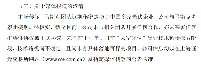![]() 2月4日晚,晶科能源发布股票交易异常波动公告称,市场传闻,马斯克团队近期秘密走访了中国多家光伏企业,公司与马斯克考察团接触。经核实,截至目前,公司未与相关团队开展任何合作,亦未签署任何框架性协议或正式协议,未有在手订单。