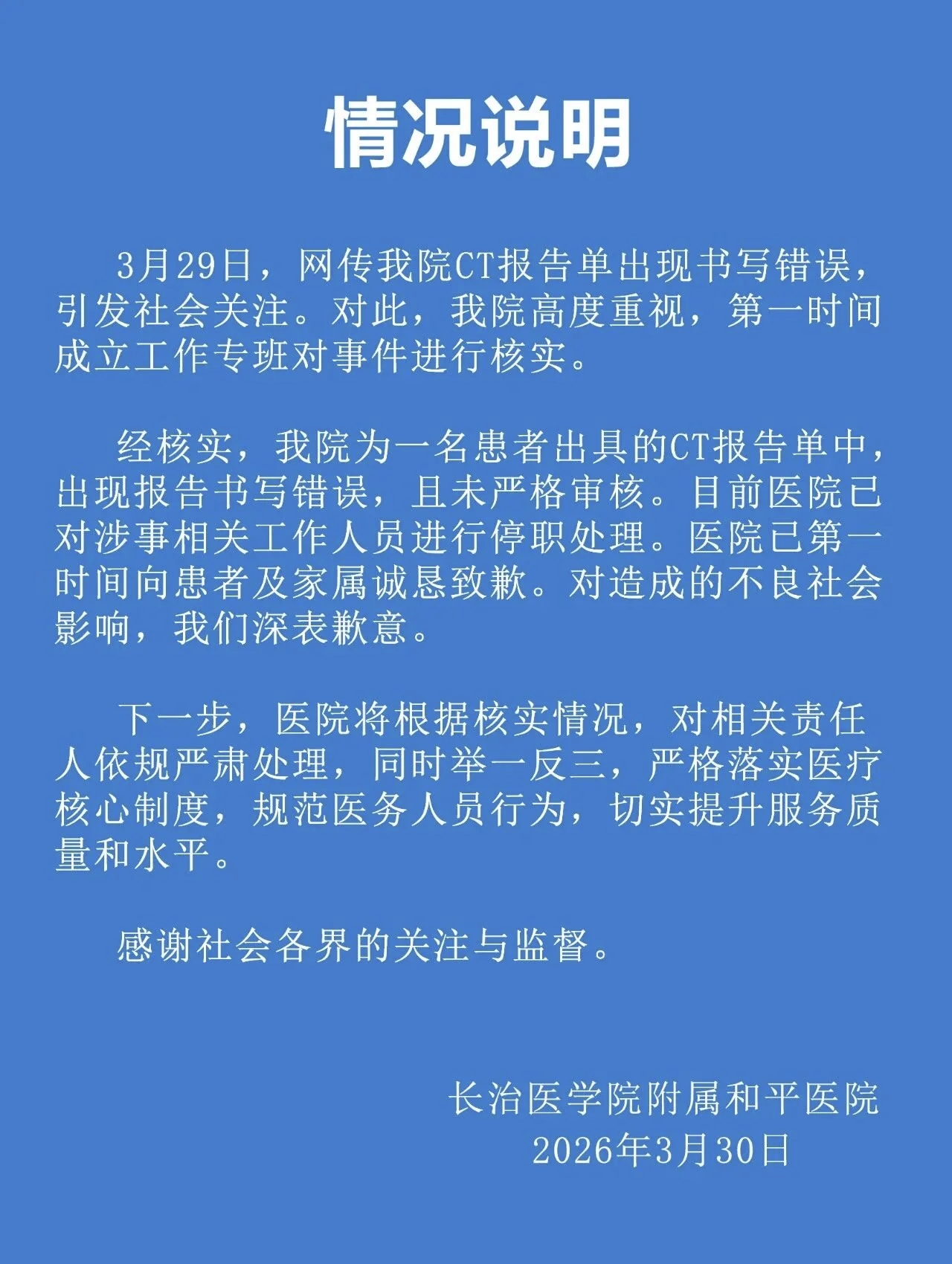 30日,长治医学院附属和平医院发布“情况说明”称,经核实,医院为一名患者出具的CT报告单中,出现报告书写错误,且未严格审核。目前医院已对涉事相关工作人员进行停职处理。医院已第一时间向患者及家属诚恳致歉。对造成的不良社会影响,院方深表歉意。