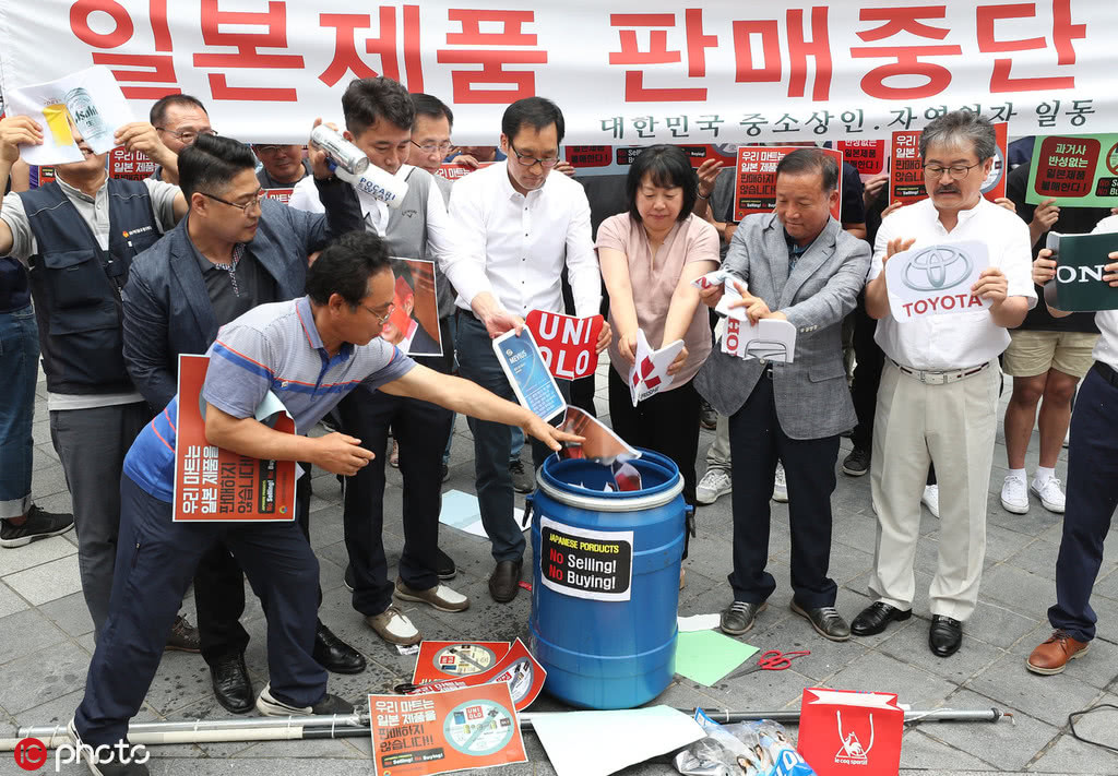 7月15日,韩国首尔,部分韩国中小企业主在日本大使馆前举行集会,呼吁抵制日本产品/IC Photo 韩国舆论指出,此次民众的反日情绪特别严重。韩国中小个体户总联谊会16日表示,自联谊会7月5日宣布禁销日本商品以来,已有3500多家小商店加入抵制活动。如果继续展开抵制运动,本周末超过5万家商店将会加入。 该中小个体户总联谊会政策理事洪春浩指出,在7月的第一周里,商店的销售额同比减少3%,但最近民众也纷纷支持抵制日货运动,各家商店的销售额反而出现上升的趋势。 一家小型超市的朴姓老板(45岁)说:“一周前开始不卖日本烟、日本酒和所有日本食品。我在货架上贴出告示——‘本超市一律不卖日本产品!’对此,客人也没问‘为何不卖日本货?’他们反而对我的决定给予鼓励。” 韩国大型超市易买得表示,本月1日至14日,日本啤酒销售量比上个月减少了24.6%,反之,韩国国产啤酒的销售量比上个月增加了6.9%。 同时,多数民众在网上发起抵制日货运动后,日本平价服饰品牌优衣库(UNIQLO)和杂货品牌无印良品的销售额分别也减少了26 .2%和19.2%。 另外,韩国人出国旅行行业排名第一的哈拿多乐旅行社(HANATOUR)的日本旅游项目预订率也大幅下降。哈拿多乐旅行社相关人士说:“(日本采取出口限制措施之前)我们日均可以接到1100余单日本旅行预订,7月8日之后日均预定量下降到了600至700人。” 日本松山大学教授张正旭表示,东京和大阪等大城市有很多外国游客,因此即使韩国人不去日本也不会受到影响。但其他日本小城市的韩国游客比例占30%左右,赴日游客减少将对日本小城市的经济造成一定的打击。“虽然不去日本旅游运动不会对安倍政府造成很大打击,但这一运动本身具有象征性的意义。” 韩国舆论指出,韩国人因独岛主权问题(日韩争议岛屿,日本称竹岛),曾在2013年发起过抵制日货行动。过去民众抵制日货主要是与独岛或历史问题有关,但这回日本宣布对韩国进行贸易制裁牵涉到国家经济生存的地步,此次民众的反日情绪特别严重。 |