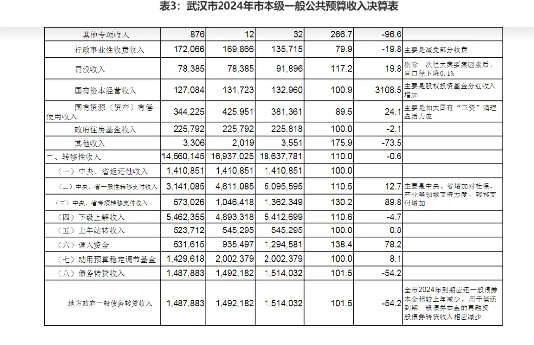 武汉市一般性转移支付收入和专项转移支付收入预算数分别为314.1亿和57.3亿元,不过,最终决算数为509.56亿和136.23亿元。武汉市财政局说明,主要是中央、省增加对社保、产业等领域支持力度,使得转移支付增加。 |