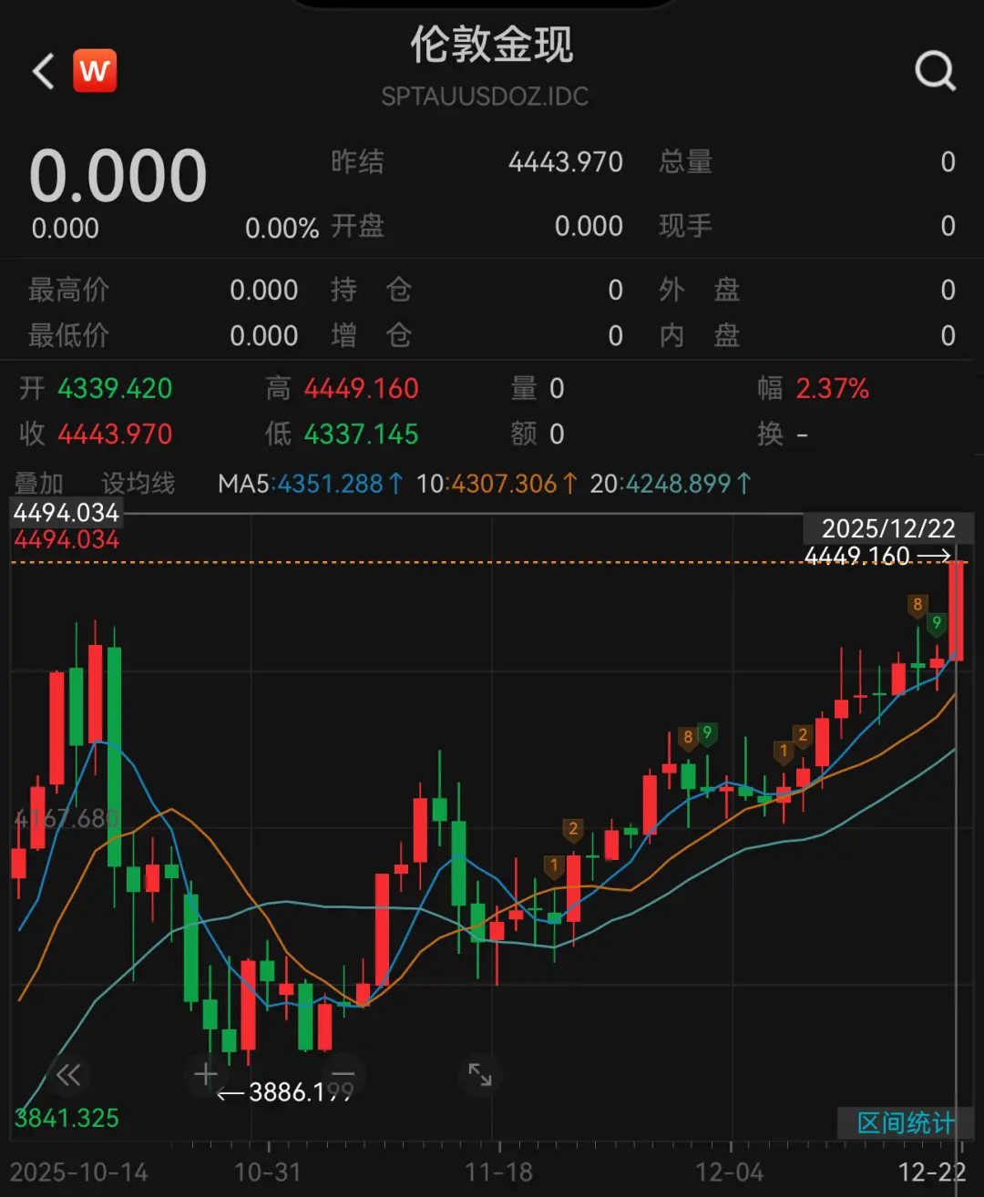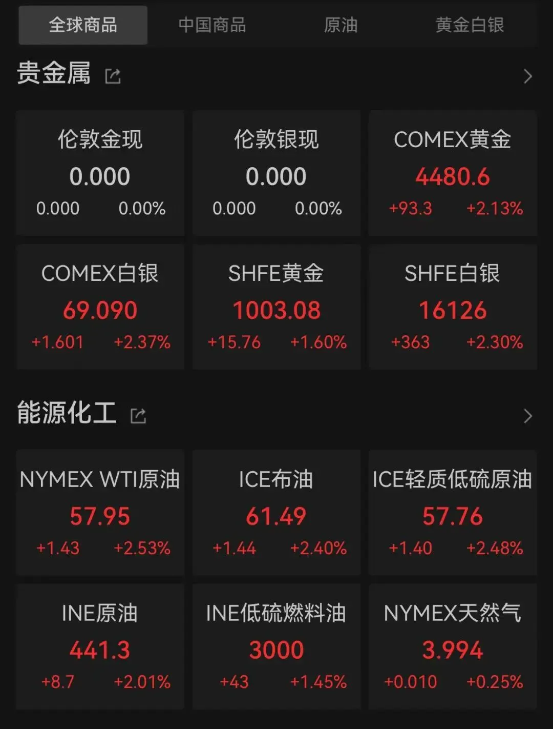 现货黄金、现货白银价格创历史新高 商品市场方面,当地时间12月22日,贵金属价格大涨,截至收盘,伦敦现货黄金上涨2.37%,报4443.970美元/盎司,创历史新高;COMEX黄金期货上涨2.13%,报4480.6美元/盎司,创历史新高。伦敦现货白银上涨2.98%,COMEX白银期货上涨2.37%,均创历史新高。
