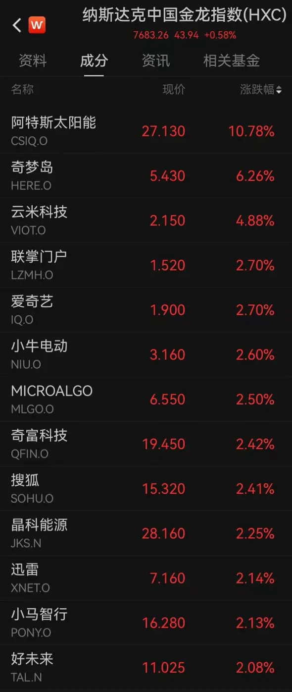 银行股普遍上涨,摩根大通上涨1.87%,高盛集团上涨0.60%,花旗集团上涨2.79%,摩根士丹利上涨1.52%,美国银行上涨1.05%,富国银行上涨1.35%。 热门中概股多数上涨,纳斯达克中国金龙指数上涨0.58%。阿特斯太阳能涨逾10%,奇梦岛涨逾6%,云米科技涨逾4%,爱奇艺、小牛电动、奇富科技、晶科能源、迅雷、好未来等涨逾2%,京东集团、阿里巴巴、小鹏汽车等小幅上涨。理想汽车、世纪互联、华住集团、金山云、虎牙、禾赛科技等下跌。