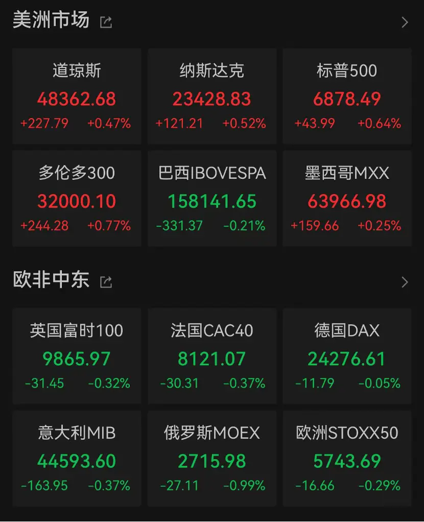 ![]() 当地时间12月22日,美股市场三大指数全线上涨,大型科技股涨跌不一,特斯拉、英伟达、谷歌-C、亚马逊、META均上涨,微软、苹果下跌。欧洲股市全线下跌,英国富时100指数、法国CAC40指数、德国DAX指数均小幅下跌。 热门中概股多数上涨。纳斯达克中国金龙指数上涨0.58%,阿特斯太阳能涨逾10%,爱奇艺、搜狐、晶科能源、好未来等涨逾2%,阿里巴巴、小鹏汽车、新东方等小幅上涨。 现货黄金价格、现货白银价格大涨,均再次创下历史新高。 美股三大指数全线上涨 当地时间12月22日,欧洲主要股指全线下跌,截至收盘,英国富时100指数下跌0.32%,法国CAC40指数下跌0.37%,德国DAX指数下跌0.05%,意大利MIB指数下跌0.37%,欧洲STOXX50指数下跌0.29%。 美股三大指数全线上涨,截至收盘,道指、纳指、标普500指数分别上涨0.47%、0.52%、0.64%。