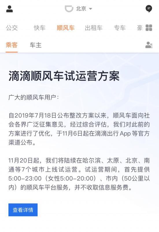 11月6日,滴滴顺风车在滴滴出行App公布了最新产品方案,同时宣布将于11月20日起,陆续在哈尔滨、太原、石家庄、常州、沈阳、北京、南通7个城市上线试运营。方案针对用户普遍关心的安全准入问题做了重点回复,在新的方案中,平台将引入失信人筛查机制,并积极探索与第三方信用产品企业合作方式,以便进一步提升用户准入门槛。 方案提到,试运营期间,将在这7个城市首先提供5:00-23:00(女性5:00-20:00)、市内中短途(50公里以内)的顺风车平台服务。试运营期间,不收取信息服务费。