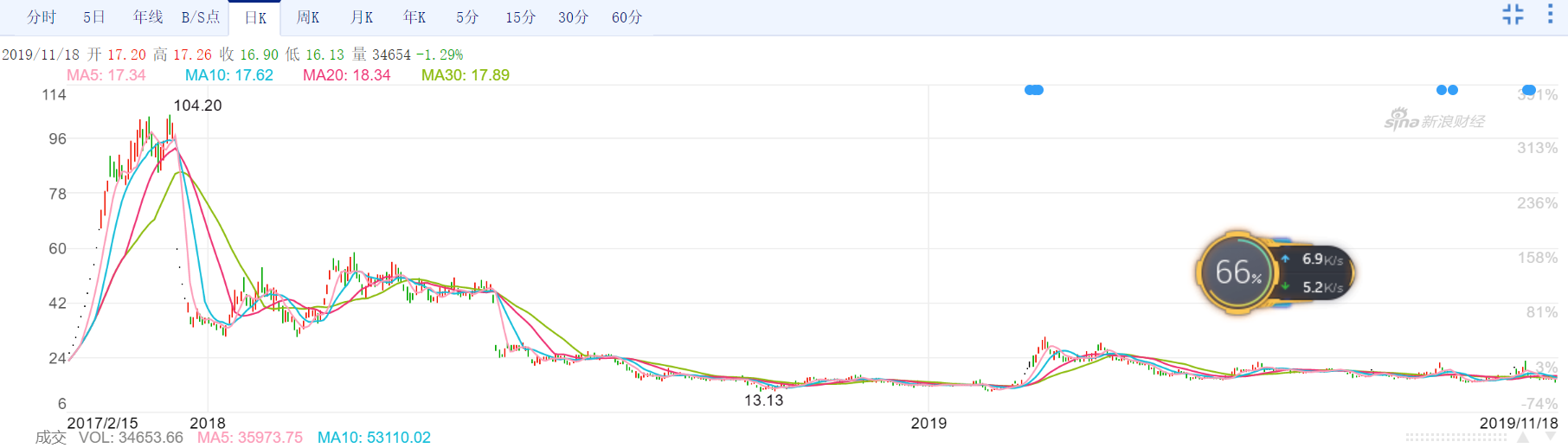 ![]() 除主营业绩出现大幅下滑外,公司还多番踩雷。2019年半年报披露了四则诉讼情况,其中三则所涉公司均为斐讯关联公司,所涉金额总计581.1万元。年报中披露的坏账情况显示,乐视控股、乐视体育和法拉第的应收账款分别为180.3万元、9.95万元和132.83万元,合计323.08万元,已经悉数计提坏账准备。 随着业绩的下滑,公司股价也一直走下坡路。距公司2017年4月的高点45.76元/股,公司股价已下跌63%。截至11月18日,公司总市值仅剩27.38亿元。