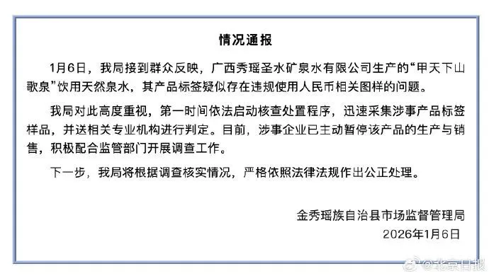 ![]() 广西金秀瑶族自治县市场监督管理局1月6日通报:1月6日,我局接到群众反映,广西秀瑶圣水矿泉水有限公司生产的“甲天下山歌泉”饮用天然泉水,其产品标签疑似存在违规使用人民币相关图样的问题。