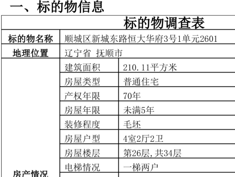 拍卖页面附件中的标的物信息显示,该房屋于2014年建成,为毛坯房,4室2厅2卫。总楼层高34层,标的房屋位于第26层。周边设施包括慈铭医院、抚顺二中、顺城区实验小学、抚顺市图书馆等,周围还有超市、宠物店、洗衣馆等。