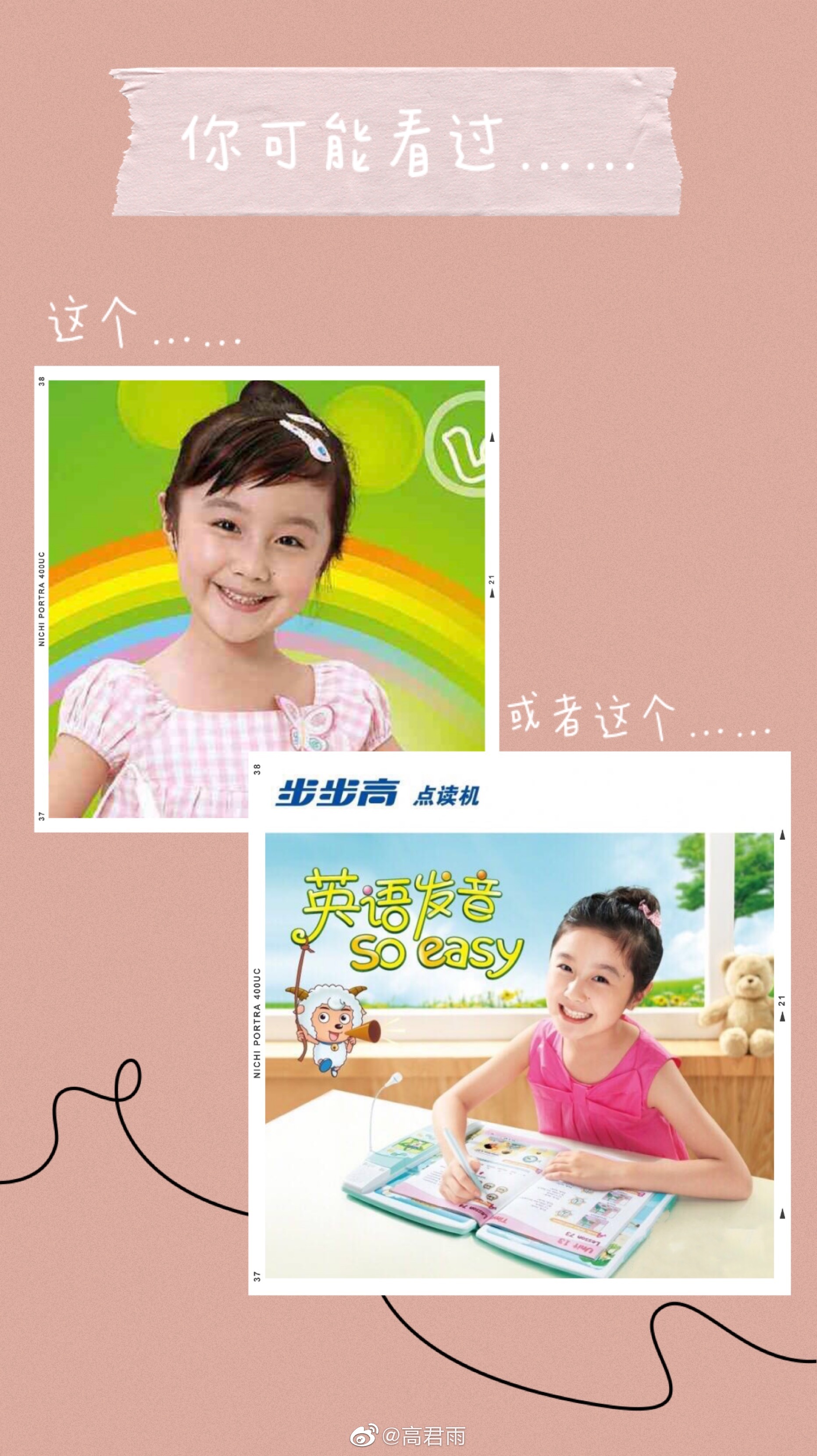 高君雨2001年8月出生,在她4岁多上幼儿园的时候,广州一家影视经纪公司来到她所在的幼儿园,挑选小朋友拍广告。