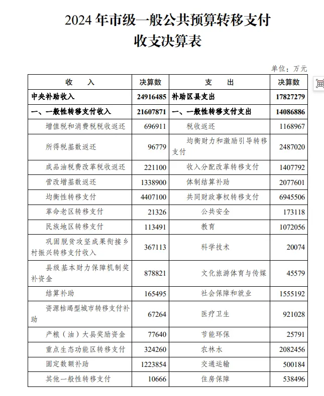 广州市财政局对转移性收入解释称,2024年,体制性税收返还收入296.7 亿元,下降0.4%。主要原因是根据当年收入据实核定的上级奖励性返还资金有所减少。一般性转移支付收入259.1 亿元,下降21.7%,主要原因是2023年中央下达减税降费专项补助资金,2024年无此因素。专项转移支付收入79.2 亿元,增长38%,主要原因是广州市积极争取上级转移支付资金支持,中央、省加大对广州市产业扶持、重大基础设施建设等支持力度。