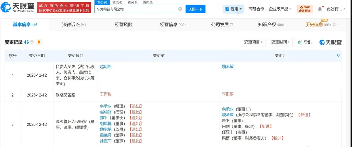 凤凰网科技讯 12月16日,天眼查工商信息显示,近日,华为终端有限公司发生工商变更,原董事长郭平卸任,由余承东接任董事长一职。同时,孟晚舟、徐直军等人卸任公司董事,多位高管职务发生变更。