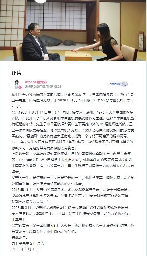 我们怀着万分沉痛与不舍的心情,向各界亲友泣告:中国围棋界泰斗、“棋圣” 聂卫平先生,因病医治无效,于2026年1月14日晚22时55分与世长辞,享年73岁。