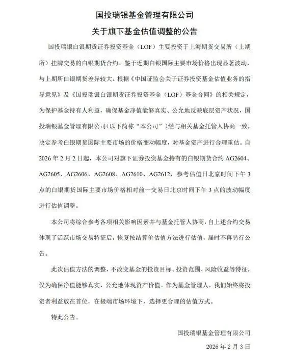 国投瑞银(UBS)基金晚间发布公告称,旗下国投白银LOF主要投资于上海期货交易所(上期所)挂牌交易的白银期货合约。鉴于近期白银国际主要市场价格出现显著波动,与上期所白银期货差异较大。根据《中国证监会关于证券投资基金估值业务的指导意见》及《国投瑞银(UBS)白银期货证券投资基金(LOF)基金合同》的相关规定,为保护基金持有人利益,确保基金净值能够真实、公允地反映底层资产状况,国投瑞银(UBS)基金经与相关基金托管人协商一致,决定参考白银期货国际主要市场的价格变动幅度,对基金资产进行合理重估。自2026年2月2日起,该公司对旗下证券投资基金持有的白银期货合约AG2604、AG2605、AG2606、AG2608、AG2610、AG2612,参考估值日北京时间下午3点的白银期货国际主要市场价格相对前一交易日北京时间下午3点的波动幅度进行估值调整。