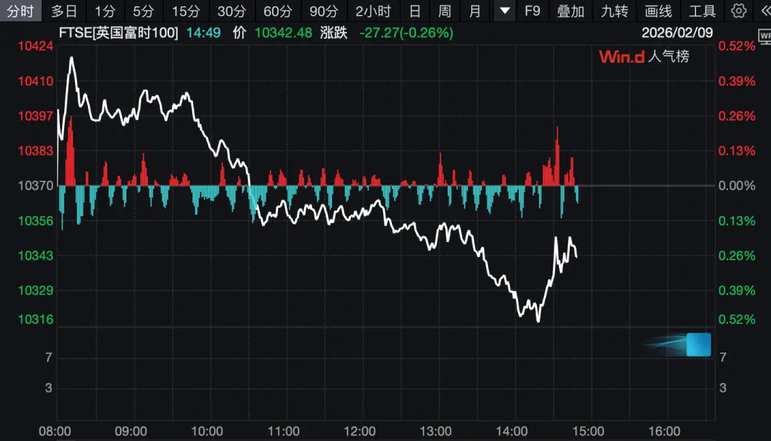 另一方面,英国政坛突发“黑天鹅”,影响该国金融市场。 据央视新闻,英国首相斯塔默的公关总监蒂姆·艾伦于当地时间2月9日辞职,这是24小时内首相办公室第二位高级官员离职。在此之前,英国首相办公厅主任摩根·麦克斯威尼因英国前驻美国大使彼得·曼德尔森涉爱泼斯坦案引咎辞职。 这场政治危机迅速蔓延至英国金融市场。英国富时100指数持续走弱,由红翻绿,截至发稿,跌幅为0.26%;英镑兑欧元一度大跌0.5%,创1月22日以来最低水平;英国10年期国债收益率上升,接近去年11月以来高点。