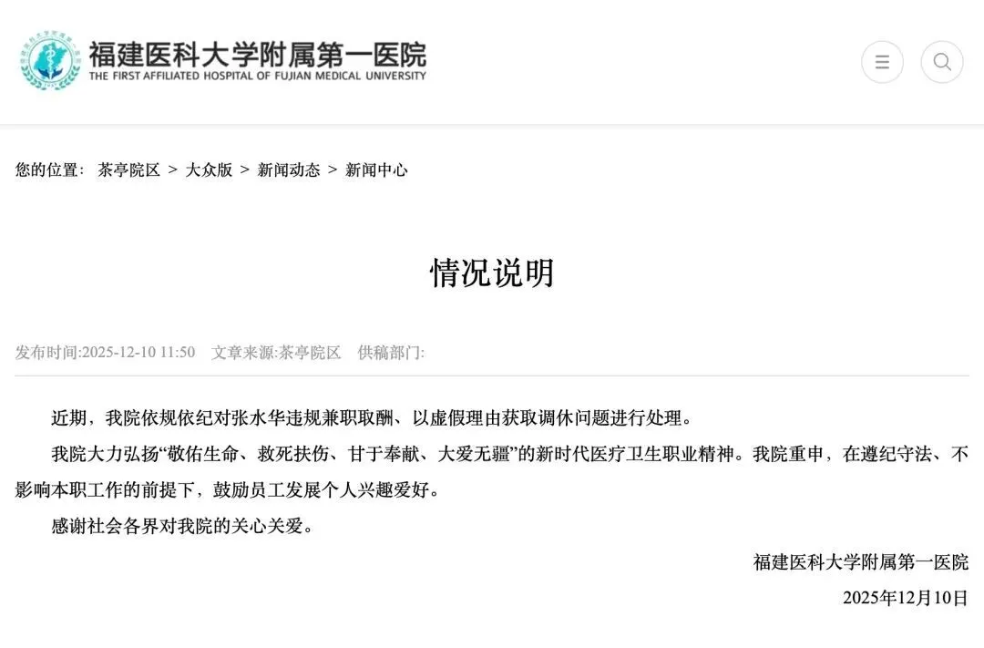 ![]() 作者|许华萍 中国政法大学刑法学博士研究生 12月10日,福建医科大学附属第一医院官网发布情况说明:近期,我院依规依纪对张水华违规兼职取酬、以虚假理由获取调休问题进行处理。根据此前在网络流传的《福建医科大学附属第一医院关于对张水华的处理决定》,张水华被医院给予警告处分,为期6个月,并且2025年度考核不能确定为优秀档次。