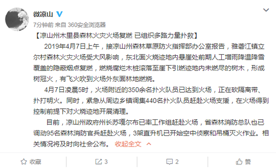 2019年4月7日上午,接凉山州森林草原防火指挥部办公室报告,雅砻江镇立尔村森林火灾火场受大风影响,东北面火烧迹地内悬崖处前期人工增雨降温降雪覆盖的隐蔽烟点复燃,燃烧腐烂木桩滚落至崖下引燃迹地内未燃尽的树木,形成树冠火,有飞火吹到火场外东面林地燃烧。 4月7日凌晨5时,火场附近的350余名扑火队员已达到火场,正在砍隔离带、扑打明火。同时,紧急从周边乡镇调集440名扑火队员赶赴火场支援,在火场得到控制前提下对火烧迹地开展清理。 目前,凉山州政府州长苏嘎尔布已率工作组赶赴火场,省森林消防总队也已调动95名森林消防官兵赶赴火场,3架直升机已开始空中侦察和吊桶灭火作业。相关情况将及时向社会公布。