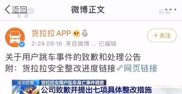 面对质疑和存在的问题,2021年2月24日,货拉拉公司发布了《关于用户跳车事件的致歉和处理公告》,表示经过认真回溯和反思事件经过,发现公司存在三个层面的明显问题,并提出了七项具体的整改措施,每项措施都明确到人,并限定了整改期限,包括:升级安全事件处理流程;在跟车订单场景中上线强制全程录音功能;扩大安全车载设备部署,试运行车内车外货厢全程监控等。 |