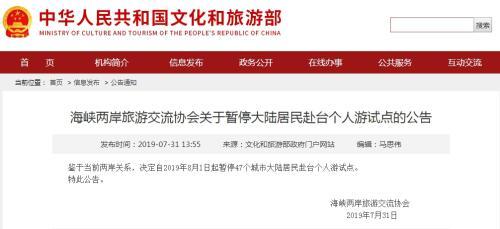 图片来源:文化和旅游部官网 暂停47城大陆居民赴台个人游试点 根据文化和旅游部官网消息,海峡两岸旅游交流协会于7月31日宣布,鉴于当前两岸关系,决定自2019年8月1日起暂停47个城市大陆居民赴台个人游试点。 此前,47个大陆赴台个人游试点城市名单如下: 北京、上海、厦门、天津、重庆、南京、广州、杭州、成都、济南、西安、福州、深圳、沈阳、郑州、武汉、苏州、宁波、青岛、石家庄、长春、合肥、长沙、南宁、昆明、泉州、哈尔滨、太原、南昌、贵阳、大连、无锡、温州、中山、烟台、漳州、海口、呼和浩特、兰州、银川、常州、舟山、惠州、威海、龙岩、桂林和徐州。