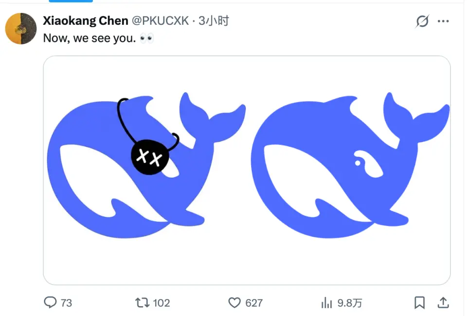 ![]() DeepSeek的「鲸鱼」,终于睁开了眼睛。 今日,DeepSeek负责多模态开发的研究员陈小康在X平台发布了一条动态:Now, we see you。配图里,DeepSeek标志性的鲸鱼logo摘下了眼罩。