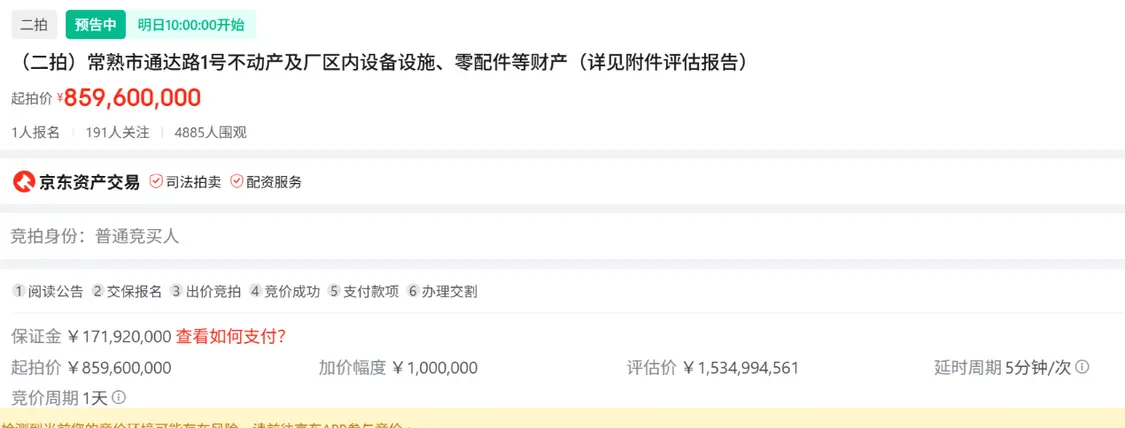 观致汽车厂房 图源:网络 凤凰网《风暴眼》了解到,该执行案件源于苏州资产管理有限公司与观致汽车、深圳宝能投资集团之间的金融借款合同纠纷。 2025年11月10日,常熟市人民法院作出裁定,决定拍卖、变卖观致汽车相关资产以清偿债务。 但姚振华强调,观致汽车旗下土地、厂房、机器设备等核心资产的第三方评估价(约80亿元)与法院认定的评估价(15亿元)存在显著差距。 另一个关键争议点在于破产重整程序与执行拍卖的衔接问题。 公开信息显示,苏州市中级人民法院已于2025年12月22日正式立案受理观致汽车的破产重整申请。 姚振华认为,依据相关法律规定,破产重整程序启动后,此前推进的资产拍卖应依法暂停,但此次二次拍卖仍在正常推进。 凤凰网《风暴眼》注意到,该拍卖已在京东司法拍卖平台上线,起拍价约为8.6亿元,为法院认定评估价的5.7折,截至目前已有1人报名。