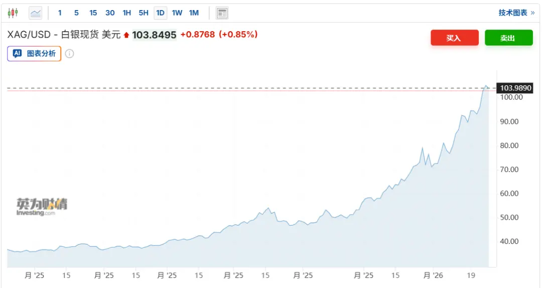 现货白银盘初再创新高,现报103.85美元/盎司。
